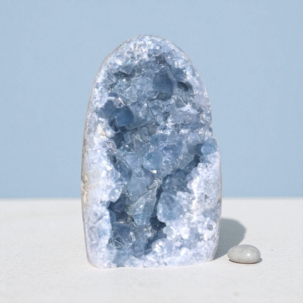 Celestite is a relatively soft mineral (ranking 3-3.5 on the Mohs hardness scale), so it should be handled with care to avoid chipping or scratching. Avoid exposure to water or direct sunlight, as prolonged sun exposure can cause the beautiful blue color to fade. Cleanse your celestite using gentle methods like smudging with sage or placing it near other cleansing crystals like selenite.
