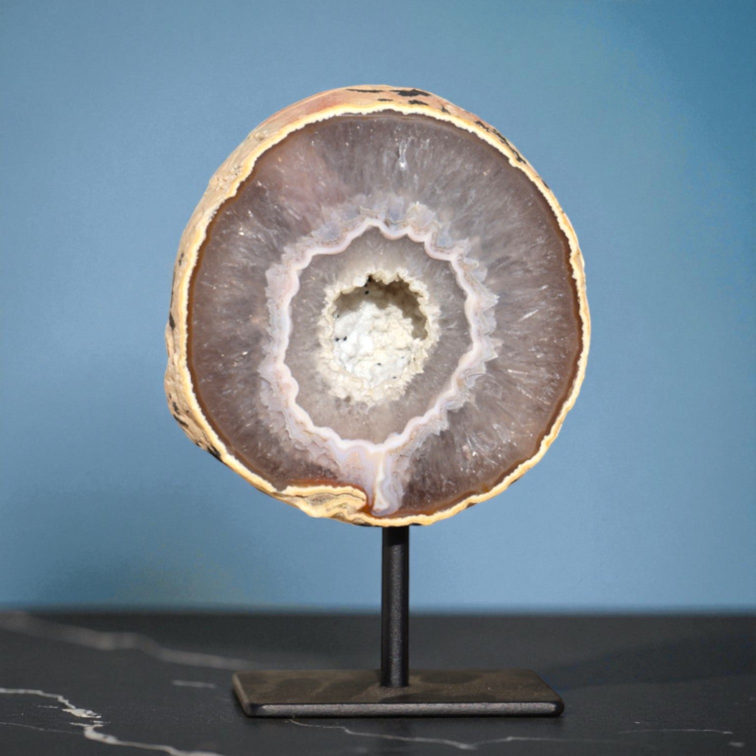 Mounted on a sleek, removable metal stand, this geode serves as both a decorative statement and a grounding energy piece. Agate is known for its stabilizing and soothing properties, believed to bring balance, protection, and emotional harmony to any space.