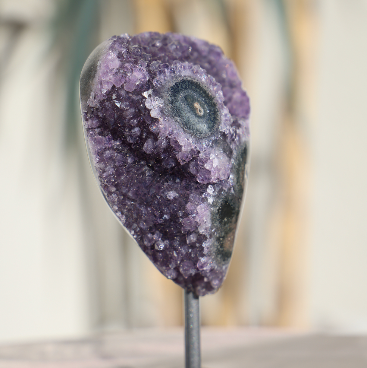 This amethyst on a stand pulses with life. The deep purple crystals with dark red hues are clustered in a way that mimics a beating heart, giving this piece a dynamic, almost lifelike presence. The surrounding stone's muted green hues with subtle red outlining contrast beautifully with the amethyst, making it a striking focal point in any space, bringing in peace, vitality and strength.