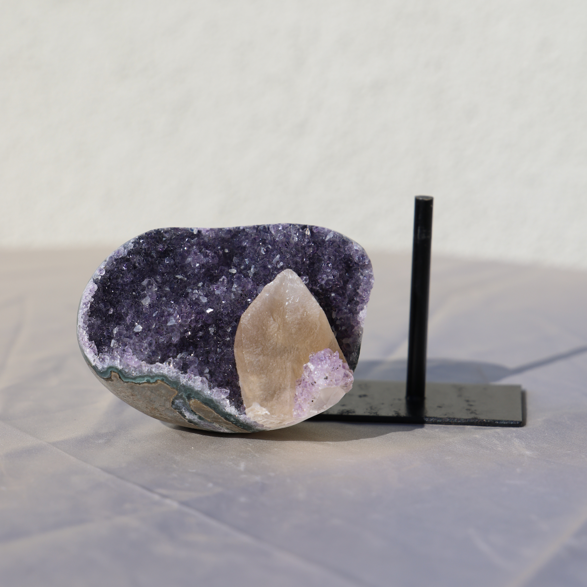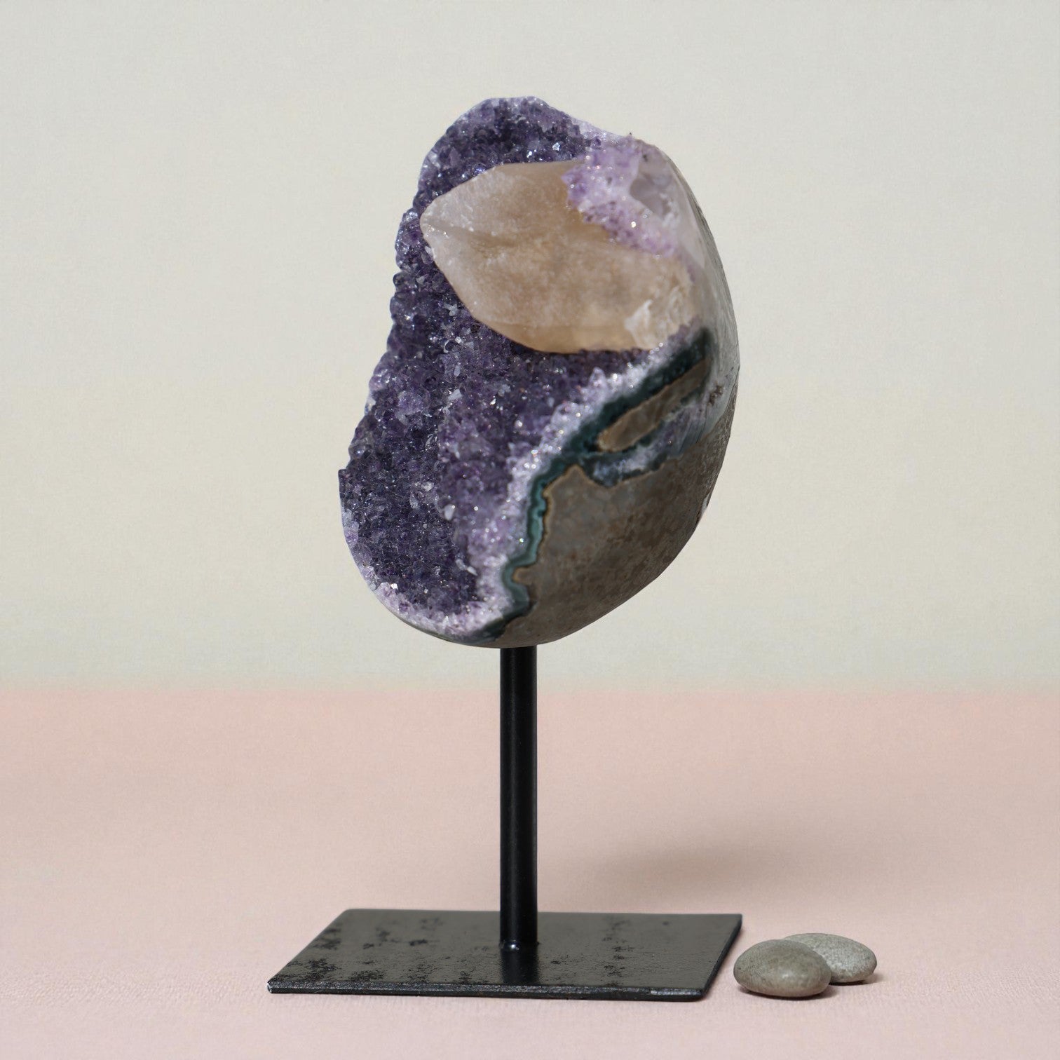 Displayed on a sleek, removable metal stand, this piece offers versatile presentation — ideal for showcasing as a refined décor accent, energy centerpiece, or part of a curated mineral collection. The Amethyst brings a sense of calm and clarity, while Calcite is known to energize and amplify positive vibrations, making their union both visually and spiritually harmonious.