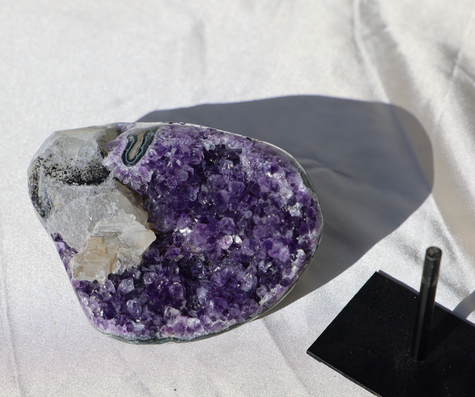 Displayed on a sleek, removable metal stand, this piece offers versatile presentation — ideal for showcasing as a refined décor accent, energy centerpiece, or part of a curated mineral collection. The Amethyst brings a sense of calm and clarity, while Calcite is known to energize and amplify positive vibrations, making their union both visually and spiritually harmonious.