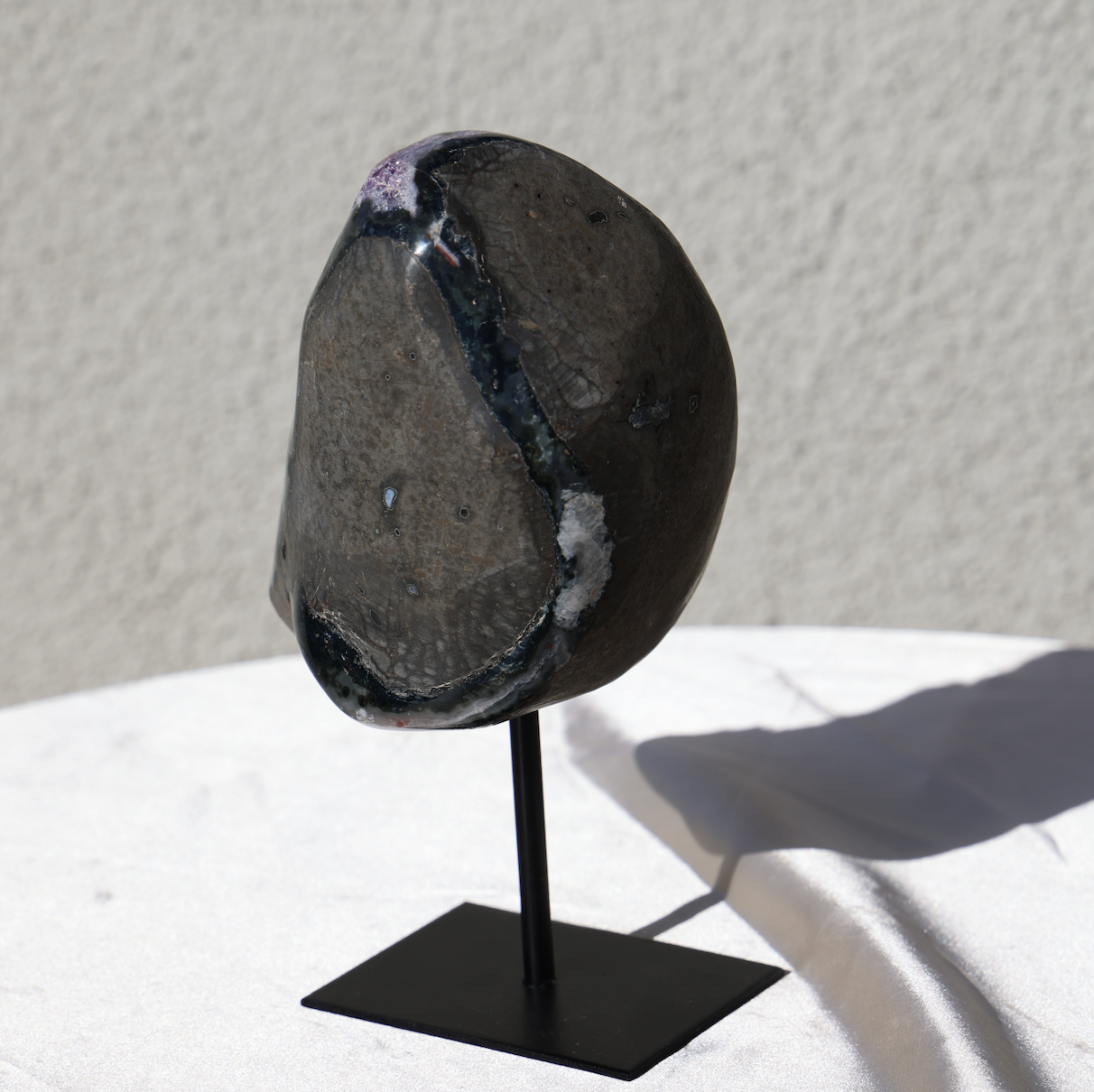 Displayed on a sleek, removable metal stand, this piece offers versatile presentation — ideal for showcasing as a refined décor accent, energy centerpiece, or part of a curated mineral collection. The Amethyst brings a sense of calm and clarity, while Calcite is known to energize and amplify positive vibrations, making their union both visually and spiritually harmonious.