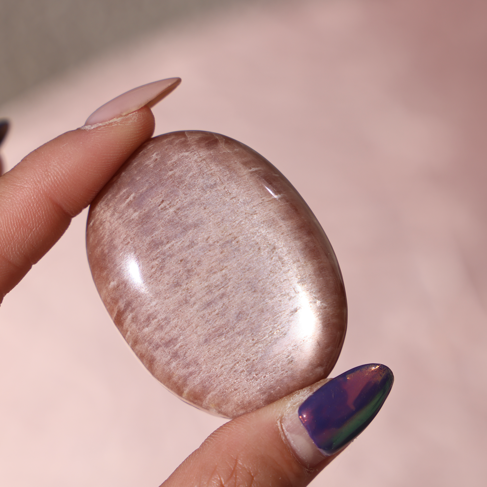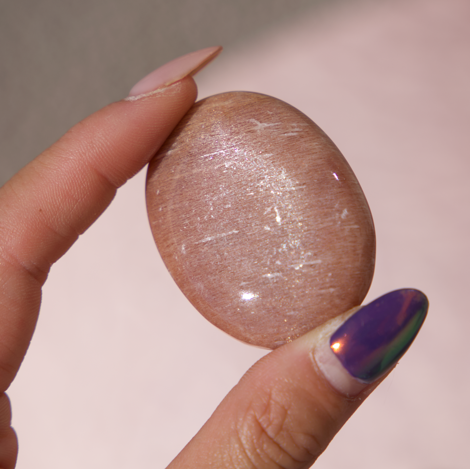 Bask in the warm, uplifting glow of our Peach Sunstone Palm Stone, a gem that truly comes alive under sunlight. Its soft peach and sandy blush tones are interwoven with a delicate shimmer, creating a natural play of light that dances across its surface. When held in the sun, subtle sparkles emerge, reminiscent of golden rays breaking over a serene horizon.