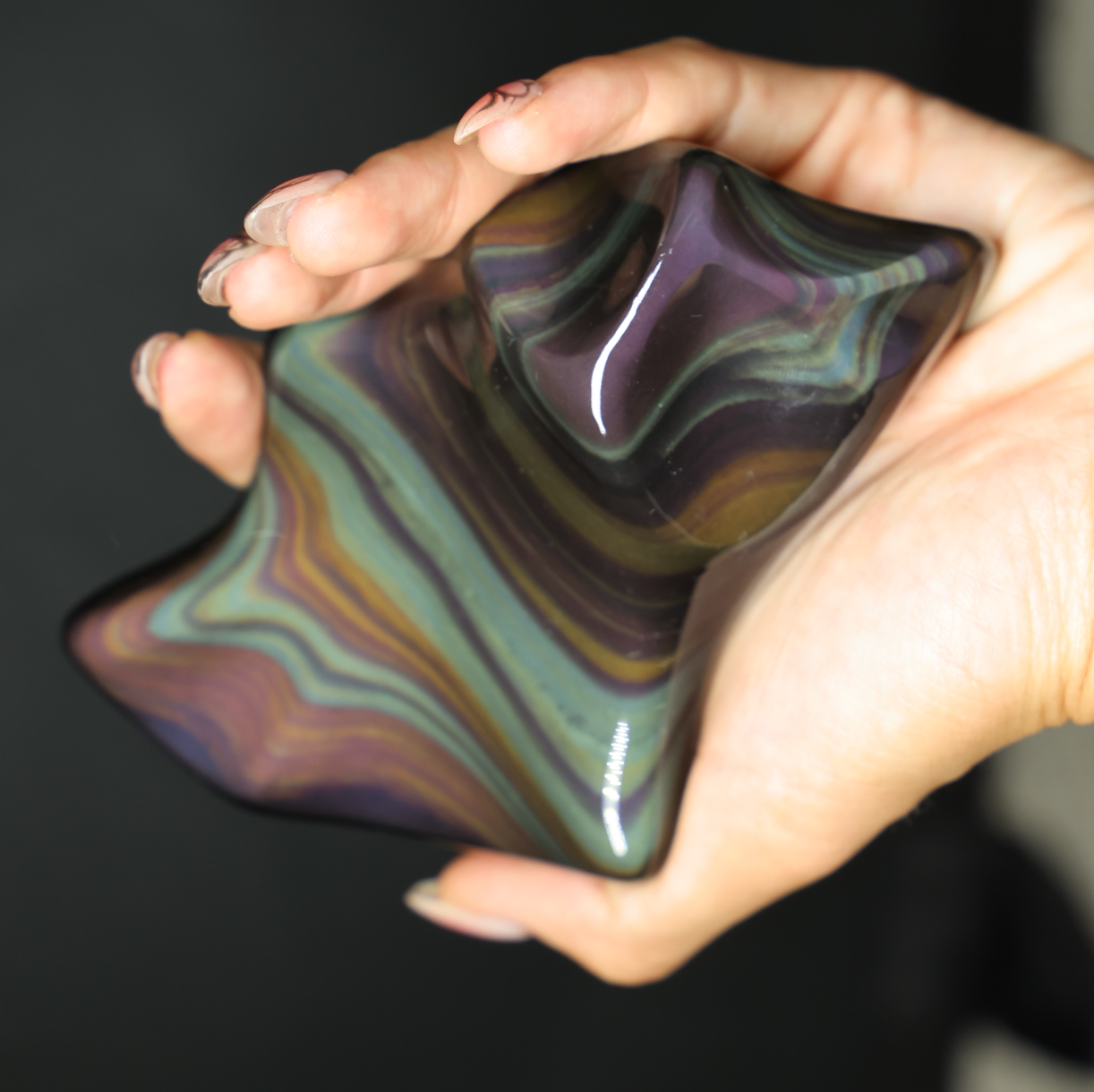 This stunning freeform is crafted from the highest-quality Rainbow Obsidian, sourced exclusively from Mexico—home to the finest deposits in the world. Its vibrant bands of purple, green, gold, and indigo ripple across the surface like liquid light, creating a mesmerizing play of colors that shift with every angle.