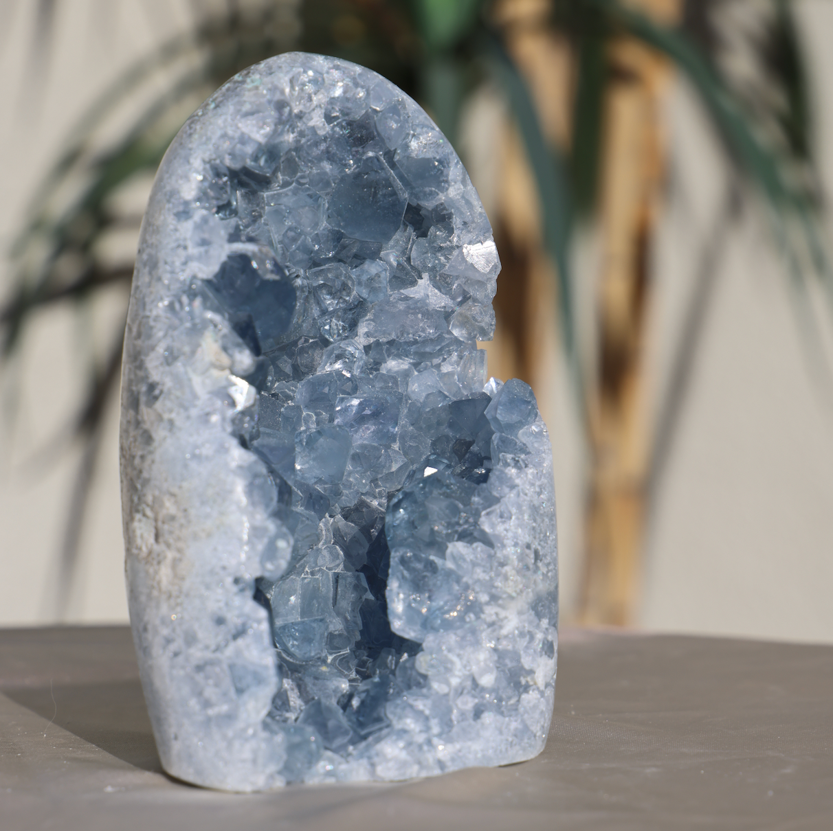 This breathtaking Celestite geode from Madagascar radiates a serene, sky-blue glow that seems to capture a piece of the heavens within. Each natural formation reveals clusters of shimmering crystals nestled within a smooth, hand-polished outer shell — a truly celestial display of Earth’s artistry.