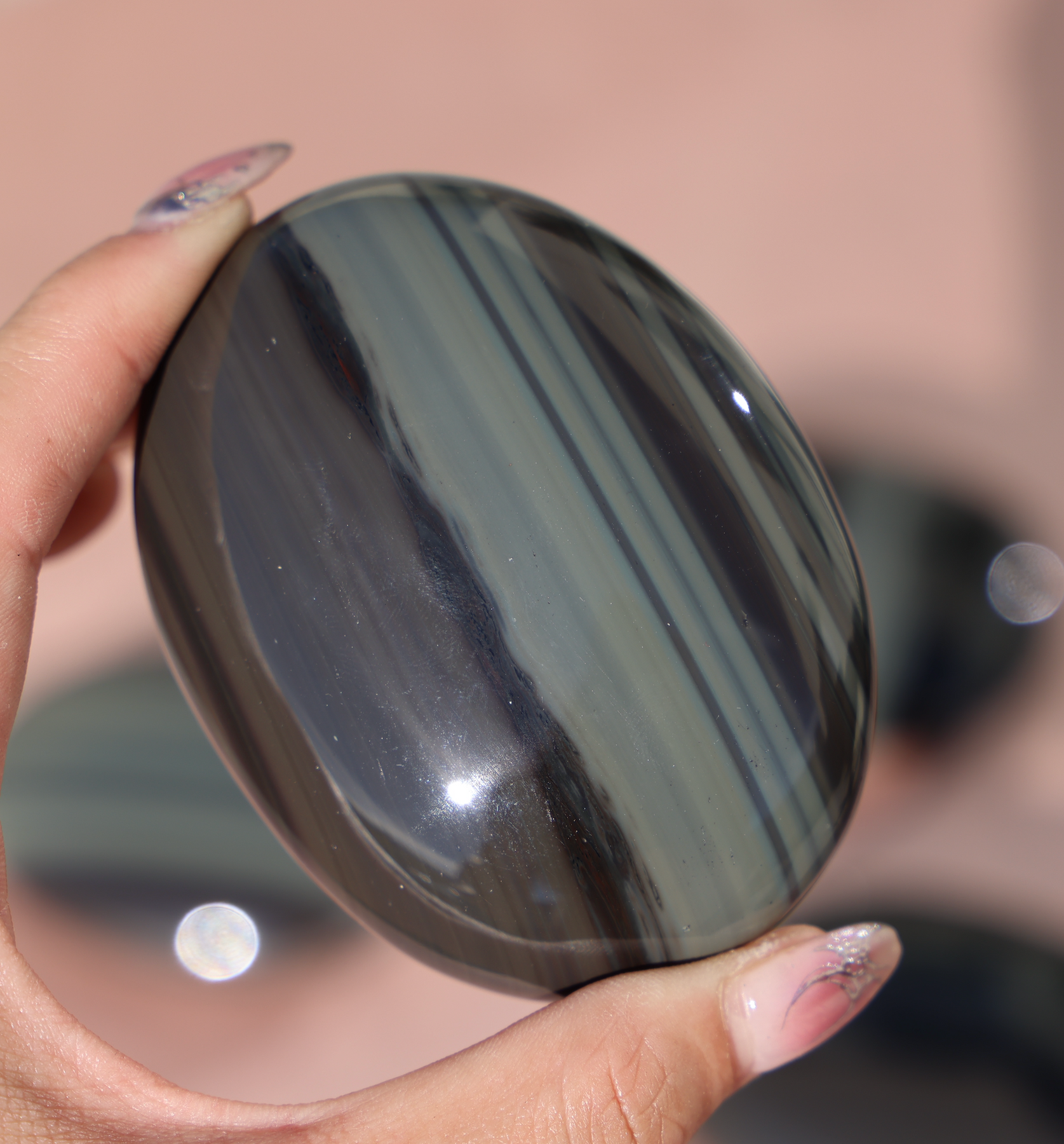 The palm stone shape fits comfortably in your hand, perfect for relaxation, stress relief, or as a stunning display piece.