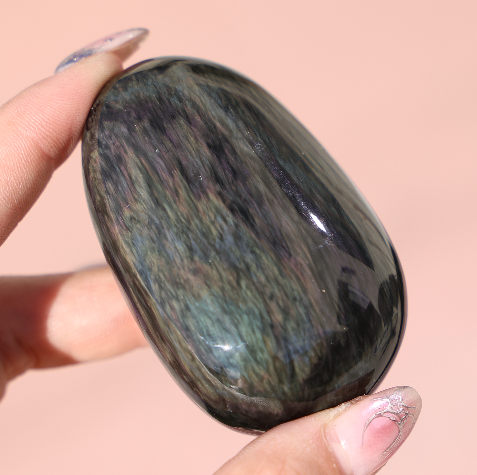 This mesmerizing Velvet Obsidian palm stone showcases deep swirls of midnight black, violet, and bronze, centered with a striking iridescent blue core that seems to glow from within. Hand-polished to a mirror sheen, each piece reveals the natural beauty and flow of volcanic glass unique to Mexico’s rich geological formations. Velvet Obsidian is believed to offer grounding energy, protection, and emotional insight, making it an ideal companion for meditation or everyday balance. Its smooth, comforting surface fits perfectly in the palm—both a captivating display piece and a powerful energetic tool.
